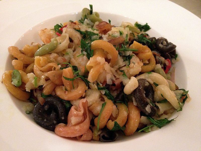 hier gab es pasta mit gartenrauke und garnelen, parmigiano reggiano und für mich noch gartenknoblauch, diverse tk-balkonchili, massenhaft olivenöl und feingeschnittenen gepressten fischrogen.