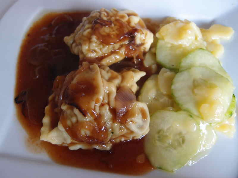 gestern maultaschen mit zwiebelsoße und kartoffelgurkensalat