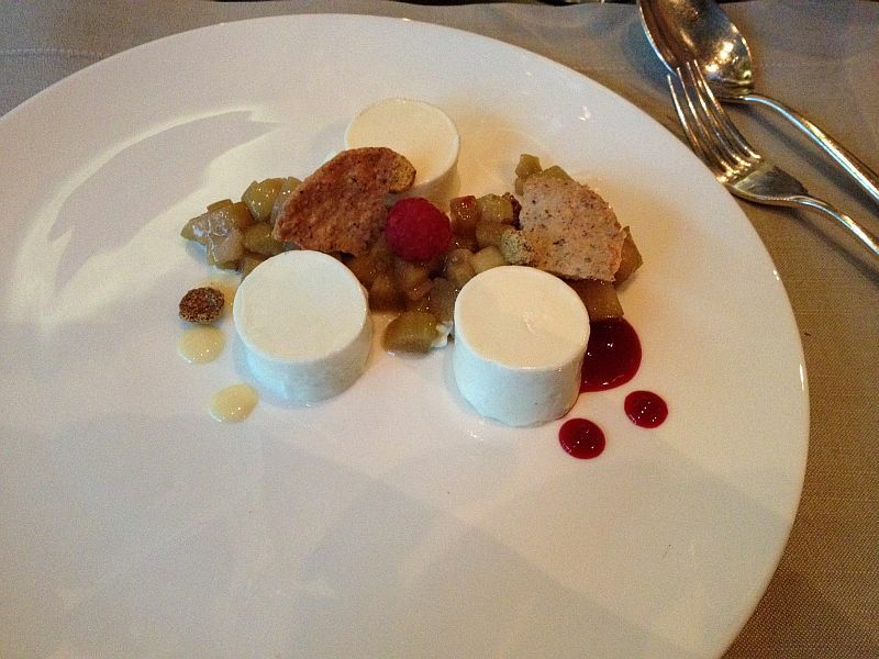 das dessert war lecker - panna cotta mit rhabarber, keks und himbeeren