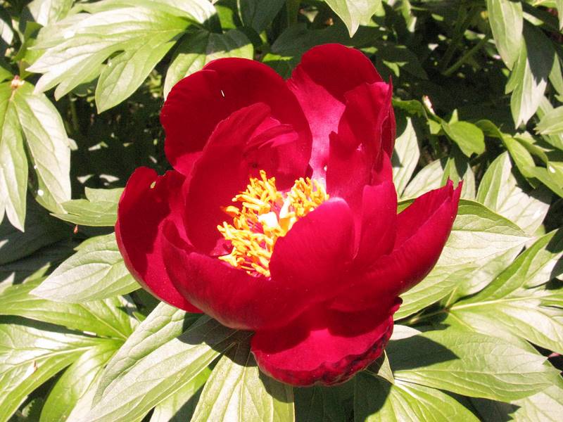 Wildtrieb? Eine veredelte Staudenpfingstrose?Konnte in einem glücklichen Moment eine geöffnete Blüte von "Illini Warrior erwischen.Wunderbar, Leo, dass es dieses Jahr mit der Blüte von 'John Harvard' geklappt hat![]()
