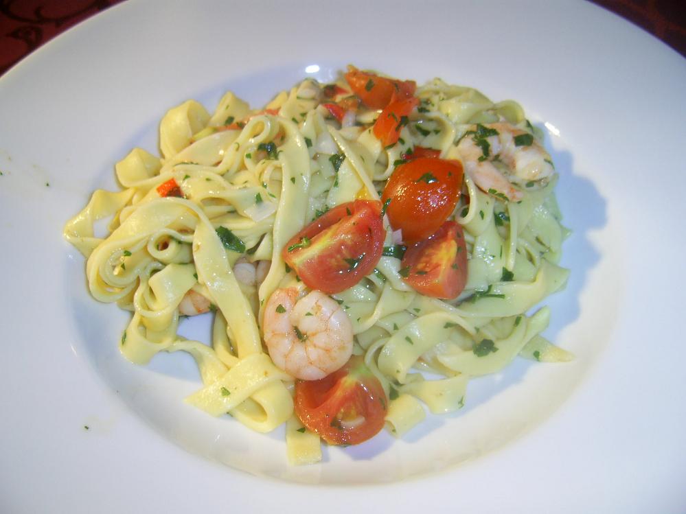 Am Montag hatten wir selbstgemachte Tagliatelle mit Garnelen, Peperoncino, Knoblauch, Petersilie und kleinen Tomaten.