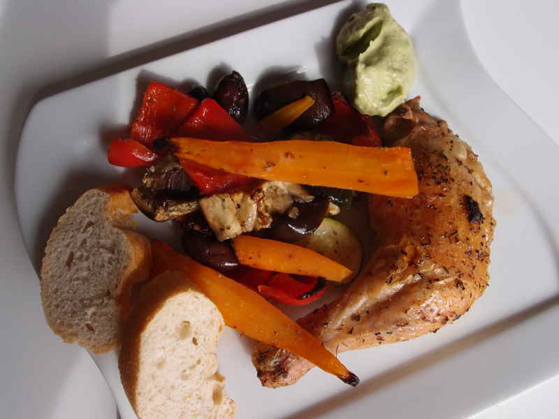und gerade gabs hähnchenkeulen mit gemüse vom backblech, avocadoquark als dip und baguette mit kräuterbutter dazu.