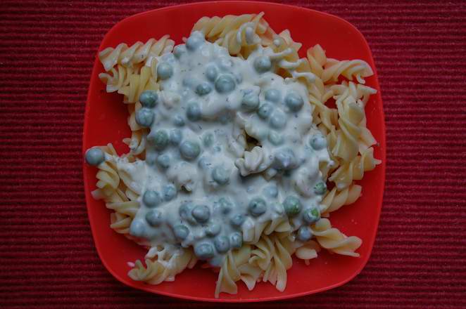 .Hier gab es Spirelli mit Erbsensahne (Erbsen, Frischkäse, Blauschimmelkäse, Sahne).Der letzte Rest der Soße verfeinerte den Grillfleischsalat heute Abend