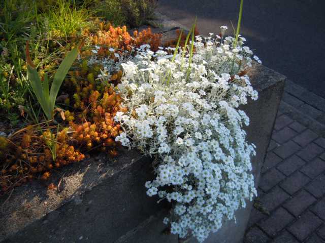 Schnee im Sommer. Cerastium tomentosum var. columnae in Betonatmosphäre unter Kiesabdeckung.