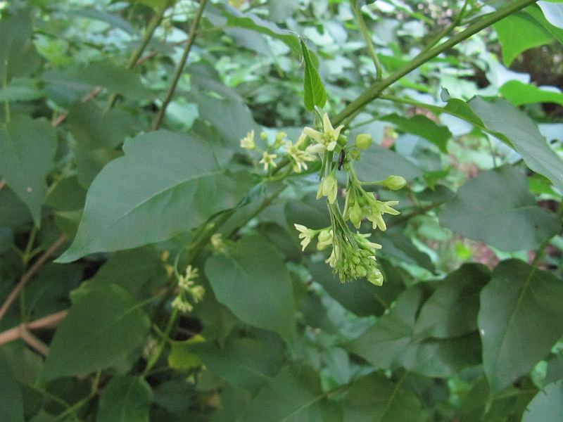 Die Schwalbenwurz, Vincetoxicum hirundinaria, windet sich an einem Flieder hoch.