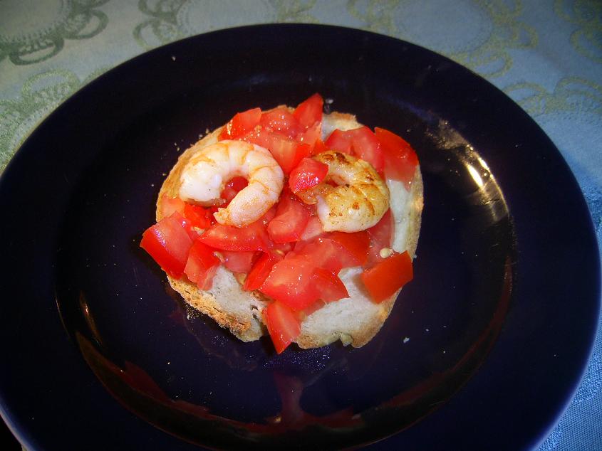 Mmmhmmm, das sieht wieder alles sehr lecker aus. :DBei uns gab es am Dienstag ein paar kleine leckere italienische Schweinereien:Zunächst gab es Bruschetta mit Knoblauch, Tomaten und Garnelen.