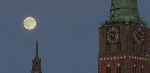 Ich finde den Vorschlag von Thomas sehr gut, die Dächer bilden so eine Diagonale und der Mond scheint sich auf den Weg bergauf zu machen, der Diagonale folgend, und muss nun über die Spitze vom Dachreiter steigen. Ist eine kleine Geschichte.Während der Aufnahme gab es wenig Möglichkeiten zu variieren, da ich den Standort quasi nicht wechseln konnte. Und der Mond ist verdammt schnell. Ich habe aber noch ein Foto ein, zwei Minuten eher gemacht, wo der Mond noch weiter links steht. Ist das besser?