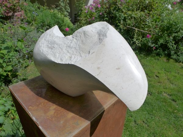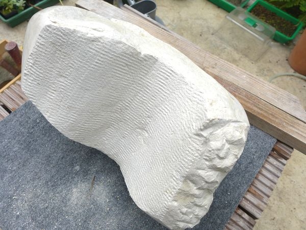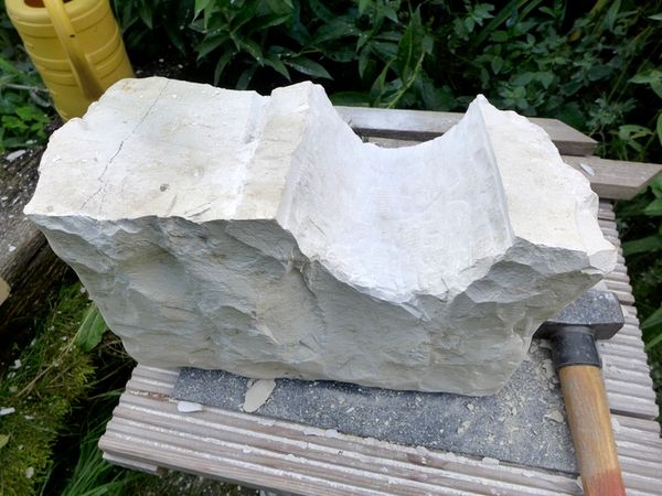 Spannender war für mich die Herausforderung mit diesem Brocken "Finike White Limestone", den mir von einem Baumaterialienhändler geschenkt wurde.Beileibe kein weicher Stein (aus dem Süden der Türkei), sondern sehr fest und "kristallin", fast schon wie Marmor.