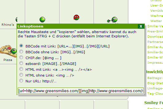 Einfach den Smiley aussuchen und anklicken und den Link unten im Fenster kopieren. Der Fokus im Menü sollte auf dem ersten Punkt stehen: BBCode mit Link.