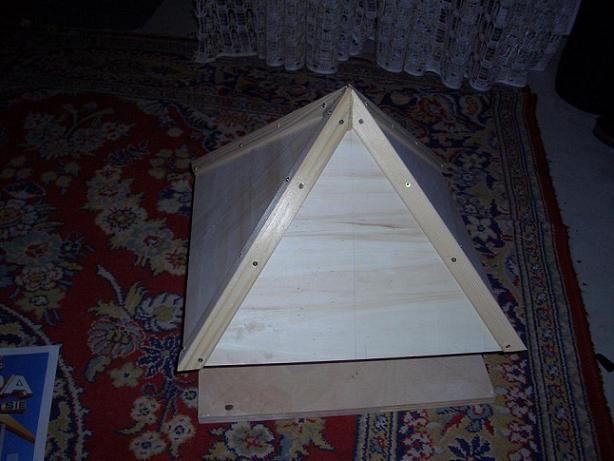 Ich muß es euch zeigen! Bin so stolz... ;DAlso erst kam das Dach... 4 gleichschenklige Dreiecke, die ich zuerst provisorisch mit Klebestreifen, später dann mit Heißkleber befestigt habe...