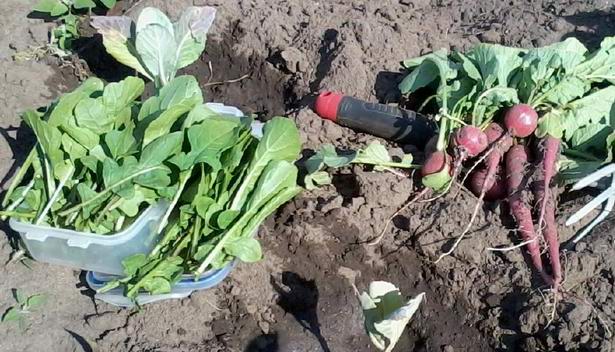 : Ruccola, Radieschen und roten Rettich.Und schon gleich eine Frage: Ist roter Rettich ähnlich den Radieschen? Oder sollte ich den auf richtige Rettichgröße wachsen lassen
