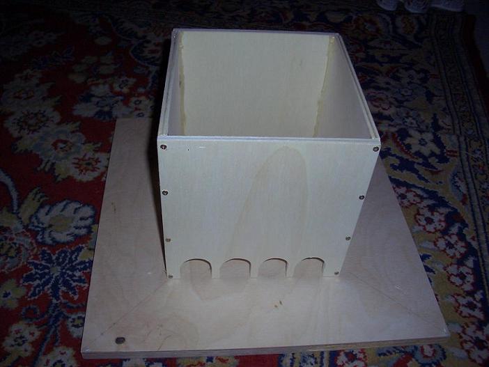 Die Bodenplatte, an der ich zum Schluß bald verzweifelt wäre, weil das Holz so spröde war und sich nicht einmal vorbohren ließ ohne zu springen.
