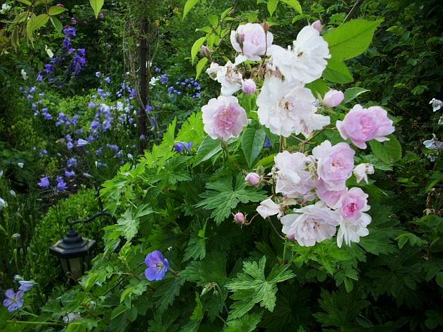 und paul´s himalayan musk reicht zu geranium rozanne herunter. auf einem meter höhe treffen sie sich.