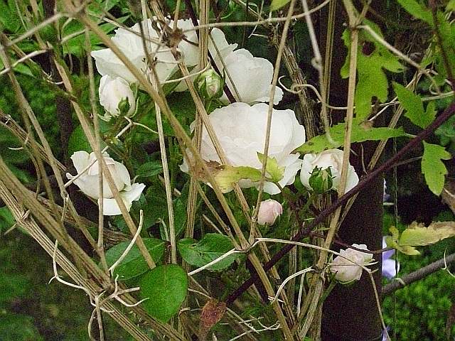 tja, rosen und clematis!da hat sich doch seafoam mit einem trieb schon auf 1,10m in die tangutica hochgehangelt. ich hätts beinah nicht bemerkt. dabei soll sie doch nur diekahlen clematisbeine kaschieren.