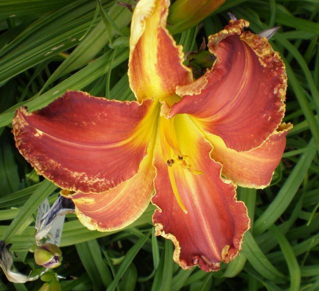 Callis, hier habe ich noch ein älteres Foto von 'Thin Man' mit den gelben Mittelstreifen in dem samtigen Rot. Die Blütenblätter sind evtl. etwas breiter, aber als ich Dein Foto der Falschlieferung sah, hatte ich irgendwie eine gewisse Ähnlichkeit im Hinterkopf. (Kann natürlich auch völlig falsch sein)