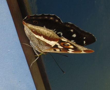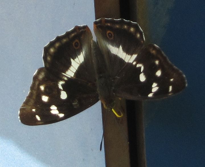 Manche Falter interessieren sich auch für Teer und Benzin, Kot und Aas angezogen.Diesen hier habe ich am Kopostplatz gefunden. Erst flog er auf dem Kompost rum.Im Wegfahren sah ich ihn an dem Kasten in dem alle sich eintragen müssen die dort abladen. Da habe ich dann die Gelegenheit wahrgenommen mich anzuschleichen.War aber gar nicht nötig an dem Holz war was das ihn so berauscht hat das er auch mein schließliches anstubsen mit dem Finger nur mit einem kurzen Flügelöffnen geantwortet hat.Es ist der große Schillerfalter.