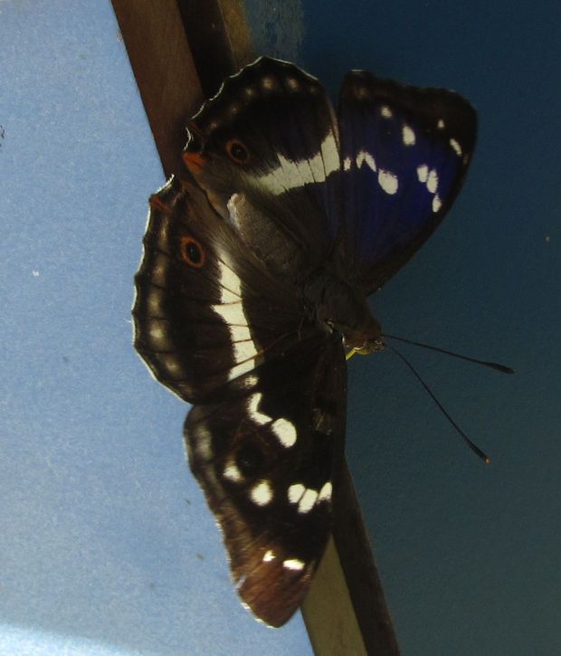 Manche Falter interessieren sich auch für Teer und Benzin, Kot und Aas angezogen.Diesen hier habe ich am Kopostplatz gefunden. Erst flog er auf dem Kompost rum.Im Wegfahren sah ich ihn an dem Kasten in dem alle sich eintragen müssen die dort abladen. Da habe ich dann die Gelegenheit wahrgenommen mich anzuschleichen.War aber gar nicht nötig an dem Holz war was das ihn so berauscht hat das er auch mein schließliches anstubsen mit dem Finger nur mit einem kurzen Flügelöffnen geantwortet hat.Es ist der große Schillerfalter.
