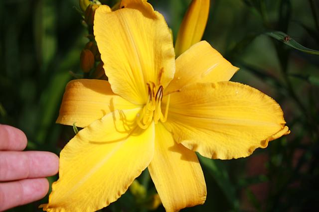 Die kam mir doch optisch vertraut vor und tatsächlich habe ich noch Sämlingsnummer und Eltern gefunden. Es ist GT09-KL30.14(Pemaquid Light x Ruffled Dude) X (Highland Pinched Fingers x Wind Master)Von Pemaquid Light hatte ich mehrere gute Abkömmlinge.Guck mal, callis, die hier ist eine von denen die damals noch nicht geblüht hatten, als du den Sämlingsgarten aufgeben mußtest und ich ihnen "vorübergehend" Asyl gewährt habe. Hat sich wirklich gelohnt, die zu retten, das ist eine der beiden die derzeit bei diesen schlechten Bedingungen sehr gut und früh öffnen und schon von weitem ein Hingucker ist. Habe meine Hand reingemogelt als Größenmesser.