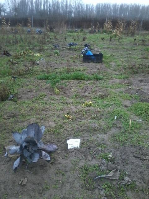 Letztes Bild vom spätherbstlichen Acker.Den Rotkohl (Köpfe warens nicht wirklich und auch nicht groß, aber für eine Portion reicht es hoffentlich) erntete ich noch vor dem Frost ab. Endivien, Rapunzel und Grünkohl stehen noch drauf. Da jetzt die Ansage kam, dass ab Dezember jeder überall ernten darf (damit möglichst wenig verkommt), stellte ich Schildchen auf, dass mein Grünkohl in Ruhe gelassen werden soll. Ich hoffe, das klappt