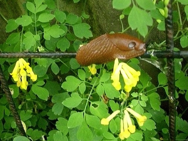 hier ist zur zeit eine invasion von riesenschnecken aus den umliegenden feuchtwiesen. jetzt bei dem regen sind sie alle nach oben geflüchtet. heut morgen sass doch tatsächlich eine von aussen an meiner terrassentür, 8 stufen höher als die terrasse. schneckenjagd ist richtig aufwändig geworden.schnecke am rankgitter: