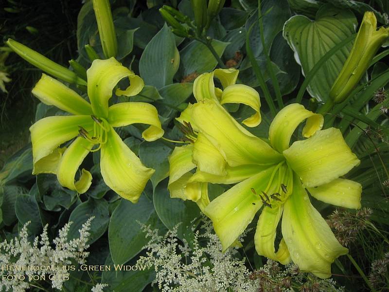 Diesen wunderschönen Spider habe ich vor 20 Jahren mal in einem Schweizer Tagliliengarten erstanden, den es leider längst nicht mehr gibt.Ich habe die Pflanze vielmals versetzt und gepäppelt, weil ich sie so schön fand, aber bei meinen Wintern konnte sie letztlich nicht überleben. In deinem wärmeren Klima schafft sie das sicher besser.Hier ein Foto aus meinem Garten.Green Widow - leider am Fototag etwas aus der Form, aber trotzdem schön grün - kam auch mit nach Hause:
