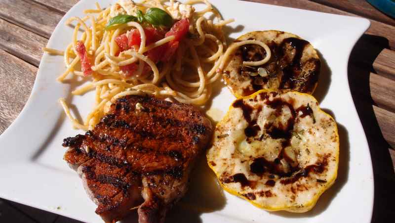 donnerstag gegrilltes mit spaghettisalat aus den resten vom vortag und gegrillter zucchini.