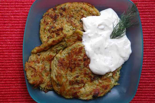 Hier gab es Zucchinipuffer (Zucchini, Kartoffeln, Dill, Ei, Petersilie, Mehl) mit Gyroscreme.
