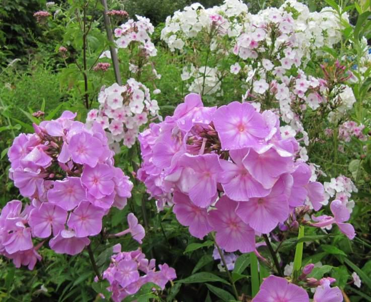 Hier mal ein Photo von Silberlachs, Perlmutt und dem namenlosen, irre wüchsigen und sich wohl auch immer weiß aussäenden Phlox. Man erkennt deutlich, wie groß die Blüten von Silberlachs sind.