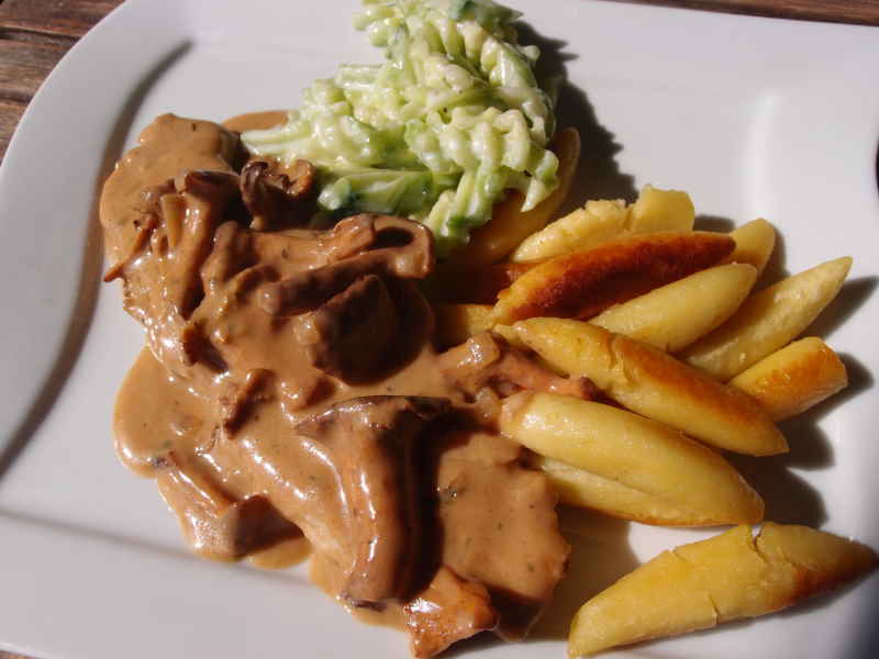 und gestern beim tiefkühler aufräumen gefundene kalbsschnitzel, mehliert und kurz gebraten mit pfifferlingsrahm, schupfnudeln und gartengurkensalat