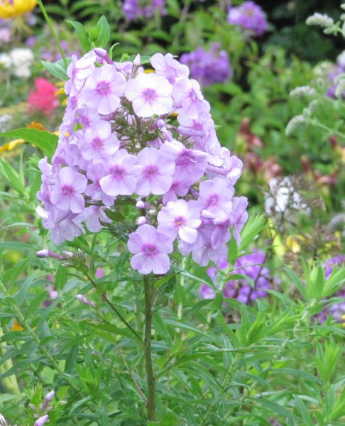 Dazwischen gequetscht steht noch 'Jeff's Blue'. Der verdient einen besseren Platz.Hier mal ein Photo von Silberlachs, Perlmutt und dem namenlosen, irre wüchsigen und sich wohl auch immer weiß aussäenden Phlox. Man erkennt deutlich, wie groß die Blüten von Silberlachs sind.