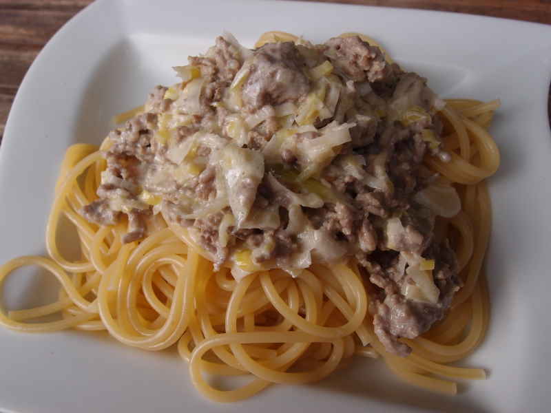 und heute hack-lauchsuppe als nudelsoße mit spaghetti und grünzeugsteller.