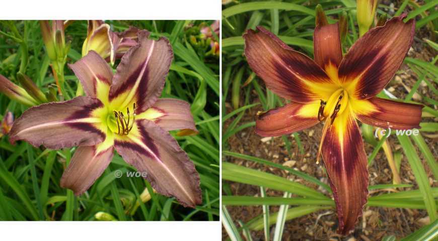 Das ist echt schwierig. Die linke bzw. untere Blüte müsste Brown Witch sein, bezüglich der anderen Blüte (ob nun Grey Witch oder Black Arrowhead) wage ich keine Aussage. Ich habe aber beide Sorten und könnte bei Bedarf nächstes Jahr den direkten Vergleich antreten.So, aus der Zeit vor der Anlage des Hemsgartens, in der so schönen unbedarften Zeit ohne Anspruch stammt auch noch folgendes Problem:2 sehr ähnliche, aber doch unterschiedliche Hems und 3 mögliche Namen (habe ich alle mal bekommen, 2 sind jetzt übrig)Brown Witch, Grey Witch und Black Arrowhead.Who is who??