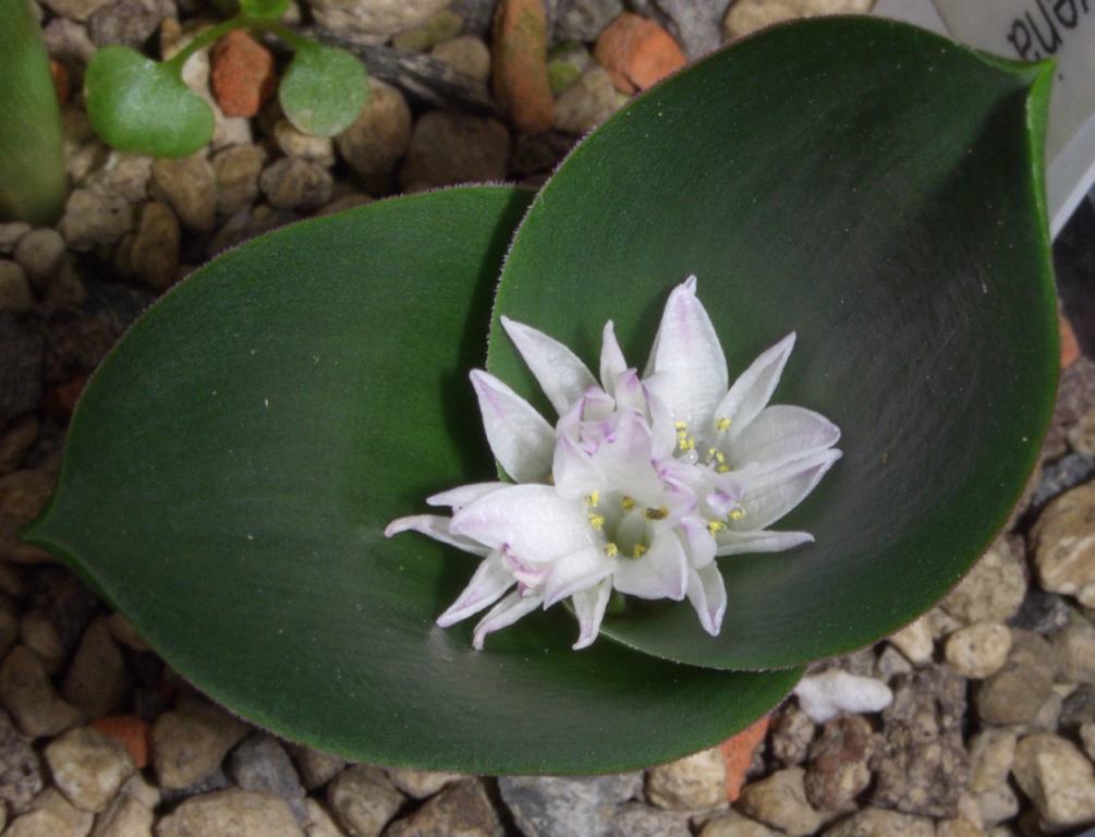 In Blüte steht aber als letzte der von mir kultivierten Polyxena-Arten die P. ensifolia. Der von mir kultivierte Klon ist ziemlich kompakt und sieht einer Massonia (die ja eng verwandt ist) viel ähnlicher als die anderen Polyxenen.