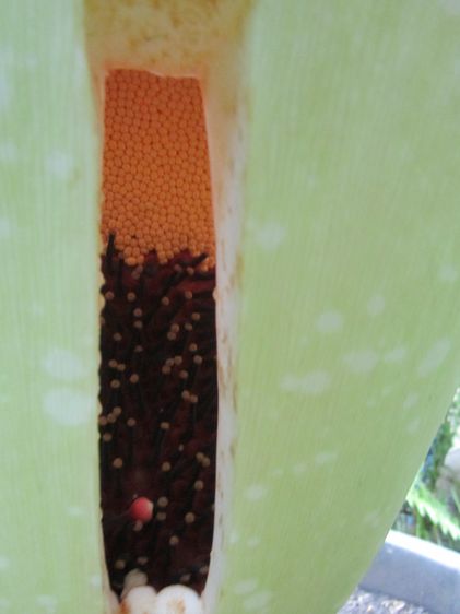 Ich war scheinbar der erste der in die Blüte fotografiert hat. Kommentar eines Gärtners. Hineingefallene Kameras und Handys werden erst nach der Kompostierung zurück gegeben. Fand ich völlig verständlich.Direkt nach mir hat erst mal jeder seine Kamera reingehalten. So war auf jeden Fall niemand zwischen Kamera und Titanwurz. 8)Hier mal ein langweiliges Bild