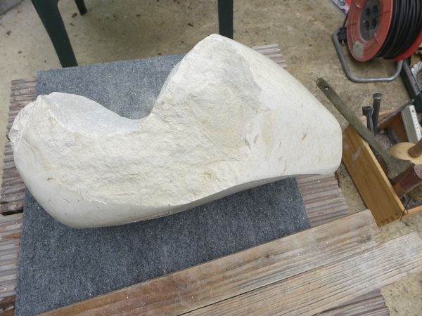 Spannender war für mich die Herausforderung mit diesem Brocken "Finike White Limestone", den mir von einem Baumaterialienhändler geschenkt wurde.Beileibe kein weicher Stein (aus dem Süden der Türkei), sondern sehr fest und "kristallin", fast schon wie Marmor.