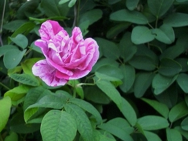 ferdinand pichards zweite blüte. die rose ist bis auf 1,50m höhe völlig nackig, sieht darüber aber gesund aus.