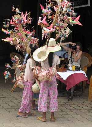 Hallo Thomas und Carola,zum Glück ist ausserhalb von Siam Rep und Teilen von Phnom Penh ein Dollar als kleinste Masseinheit noch nicht verbreitet. Auch das Powerselling von Kindern und agressive Bettelei gibt es in den anderen Orten nicht. In Teilen von PP ist es aber noch weit schlimmer als in Angkor. Dort ist es regelrecht organisiert. Die Kinder laufen ab Mittag bis in den späten Abend mit richtig schweren Bücherkisten herum. Ist eine Gegend abgegrast werden sie per Moped oder Tuktuk woanders hingebracht. Die wenigsten dort sind zu einem Spass aufgelegt. Den meisten sieht man an, dass es schwere Arbeit ist. Ein paar haben es ein 'besser', sie haben nicht so schwere Sachen zu schleppen und sind auch (häufig als Gegenleistung für einen Verkauf) als Fotomotiv gefragt. :-\Gruss Ulli