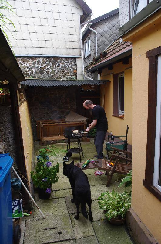 Das wäre eine Baugenehmigung, die ich mir bei der Vermieterin einholen müßte. Auch ist es fraglich, ob ich aufgrund des Alters nicht noch mehr Genehmigungen brauche. Wir vermuten, daß das Haus älter ais 100 Jahre ist. Das Nachbarhaus, identische Bauweise, ist gebaut 1855.Ne, das sehe ich anders. Das ginge schon. Wenn Du den Hof verbreitern würdest, müßte der Hang ein stückweit terassiert werden.Vergrößern kann man den Hof leider nicht, der Hang ist zu steil.