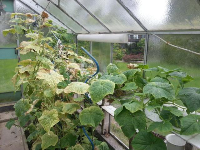 Hallo,ich habe nun seit einigen Jahren das gleiche Problem mit meinen Schlangengurken im Gewächhaus. Ich kauf im Frühjahr die veredelten Gurken im Topf. Sie gehen auch gut ab im Gewächshaus und Gurken kommen auch reichlich. Nach einiger Zeit fangen die Blätter an gelb zu werden und abzusterben. Die Blüten sterben ab und es kommen wenig neue Gurken. Wie gesagt, das habe ich schon seit ein paar Jahren. Kommt mir bald vor als ob ein Parasit im Gewächshaus sitzt. Ich habe mal 2 Bilder angehängt. Vielleicht hat eine mal einen Tip was das sein könnte.mfg Sangwal