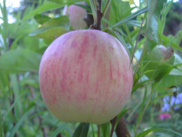 Im letzten Jahr bekam ich einen kleinen Apfelbaum von einer Kollegin geschenkt, einen 2 jährigen Buschbaum, auf M 26 veredelt.Auf dem Sortenschild stand Malus 'Weißer Klarapfel' CAC. Ich freute mich sehr, denn ich mag weiße Klaräpfel.Letztjährig trug er 2 Äpfel, dieses Jahr wieder zwei. Allerdings bin ich sehr arg im Zweifel, dass es ein überhaupt der Klarapfel ist.Das einzige was dafür spricht, ist die sehr frühe Reifezeit, ich habe die beiden Äpfel am 2.08. noch knackig, aber reif verspeist. Also tatsächlich Frühapfel. Auch ist er säuerlich, aber eher sehr fade und so habe ich den Klarapfel überhaupt nicht in Erinnerung, sondern eher spritzig. Auch die Farbe kommt überhaupt nicht hin, meines Wissens ist er grünlich-gelb und nicht rot.Kann ihn vielleicht jemand anhand der Fotos bestimmen?