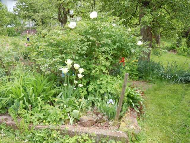Ja, das ist wohl so.Aber irgendwo mussten sie ja hin, wenn man sie schon sammelt.Gedacht war eine Art Strauchpfingstrosenhecke zwischen Sitzplatz und Gemüsegarten.Das Beet liegt im Schlagschatten auf der Nordseite des Birnbaumes, für Gemüse hielt ich es für nicht so geeignet. Mich wundert, dass der verirrte Kürbis dort gut fruchtet.Im Verhältnis zu der Beetgröße finde ich die Strauchpfingstrosen zu groß. Wie immer - das ist mein ganz persönlicher Geschmack.