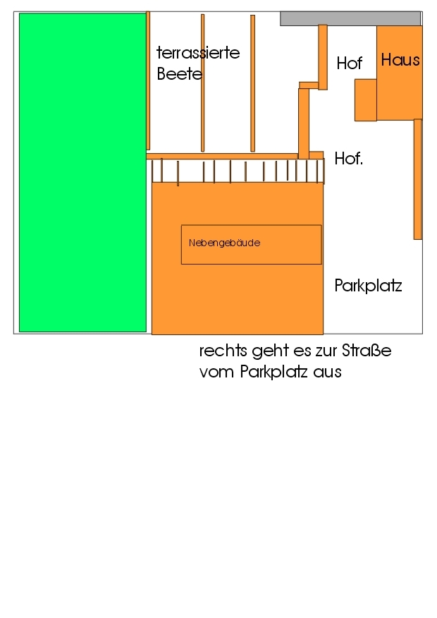 Eine konsequente Umwandlung des "Hofes" in eine Art Wintergarten, zumindest bis in den Bereich des "Stiefelraums" oder der Treppe, von der Gartenmauer zum Haus hinüber mit Doppelstegplatten nach oben verschliessen, eventuell mit Zwischenabstützung?Wäre das nicht ne vernünftige Alternative, die auch noch gut aussieht und etliche Probleme lösen könnte, bis auf das anderweitig abzuführende Schlammwasser aus dem Garten? Mit ner Option auf später einzubauende Tür?...Und dein Mann könnte trotzdem noch aufm Parkplatz grillen!Und du könntest dann also das ganze Spektrum an Wintergartenpflanzen durchsuchen zur Verschönerung...Mein erster Gedanke: Weg mit diesen Wellblechdächern. Die engen fürchterlich ein und sehen, ich sags jetzt mal: schrecklich, aus. Ich würde unbedingt eine Verbindung zu den terassierten Beeten schaffen. geht da eine Treppe hoch?
