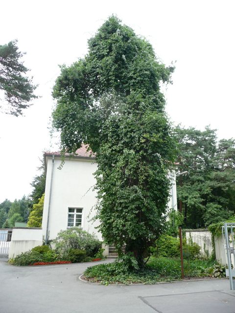 Wir sind heute auf dem Rückweg von Moritzburg, wo wir uns die Staudenpflanzung entlang der Schloßallee angeschaut haben, dieser Kletterpflanze begegnet. Unter ihr (als Klettergerüst) befindet sich eine ausgewachsene Kiefer.