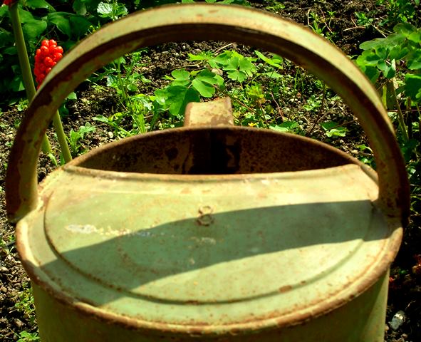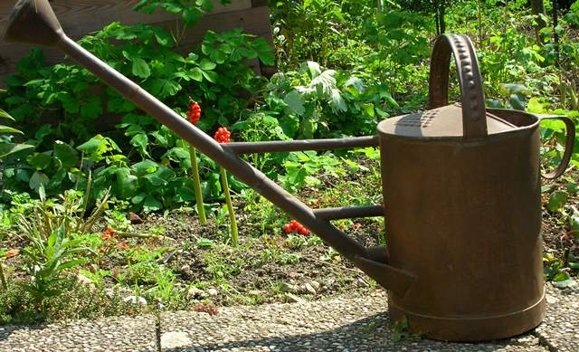 Genau genommen handelt es sich um Gießkrüge, wie sie im 15. und 16. Jahrhundert entwickelt und verwendet wurden. Die gezeigten sind natürlich Nachbildungen bzw. freie Nachbildungen. Der Boden ist siebartig durchlöchert:Bild.Oben befindet sich eine Öffnung. Zum Befüllen taucht man den Gießkrug in das Wasser, anschließend verschließt man die obere Öffnung mit dem Daumen. Durch den so erzeugten Unterdruck verbleibt das Wasser im Krug, man läuft zu den zu gießenden Objekten und los geht's. ;)Zum Nach- und Weiterlesen siehe Hippe, Krail und Rasenpatsche.@Typhoon, lieber wieder richtige Kannen??? ;D