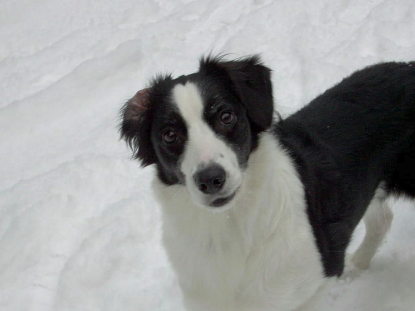 Heute morgen im Schnee:Nelly guckt nach, ob in der Nacht Nachbar's Katze wieder im Garten war
