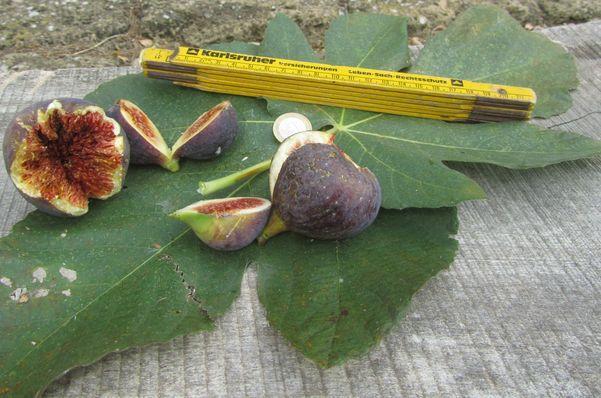 Ich hatte das Vergnügen einige Feigensorten in einem Garten in Italien zu kosten.Ichhabe von allen dort vorkommenden Feigen Stecklinge geschnitten.Einige sind vermutlich doppelt vorhanden.Leider war das Wetter für Feigen dort sehr ungünstig. Die erste eigentlich sehr gute Sorte platzte vor der Reife auf. Fruchtfliegen erledigten den Rest.Hier die erste Sortegroße Früchte Blau etwa die Hälfte der Blätter ist dreiteilig.