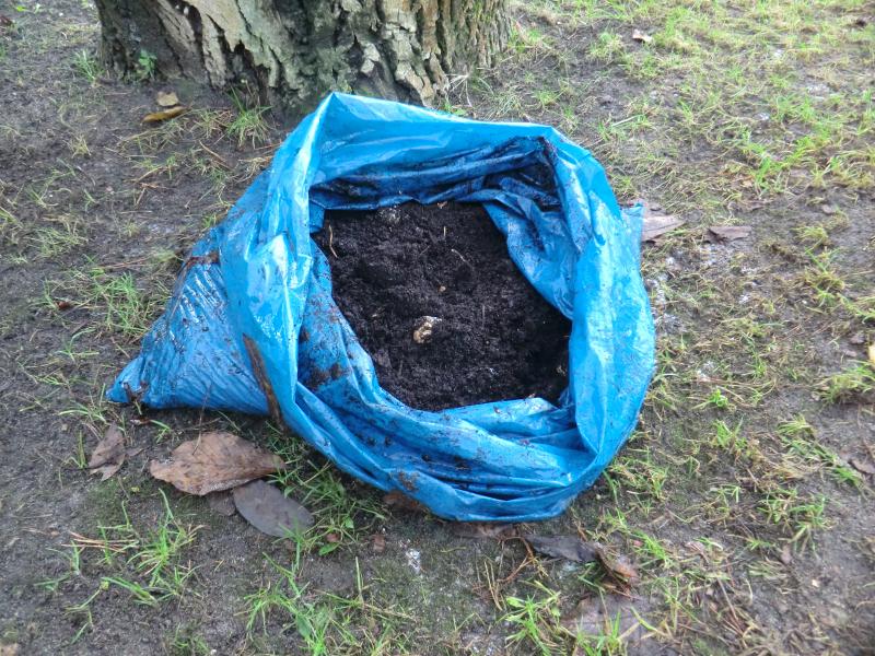 Schon 2015 hatte ich testenshalber zwei blaue Müllsäcke voll Walnusslaub gestopft, zugebunden und einfach unterm Rhodo stehen gelassen und ignoriert. Das Zeug kompostierte sich darin ganz von allein. Es blieb von einem vollen Laubsack wirklich nur dieses bisschen Erde übrig.