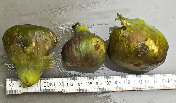 Ich habe gerade eine Dorée gepflückt. Bei dieser Sorte fällt auf, dass der untere Teil der Rückseite der Feige nicht komplett durchreift. Das ist jedes Jahr der Fall, zumindest hier. Dieser "grüne" Teil beeinträchtigt den Genussfaktor, der in den fleischigen und saftigen Teilen der Feige durchaus gegeben ist, aber sich für mich bestenfalls im besseren Durchschnitt befindet (Ronde de Bordeaux ist für mich hier um 2 Klassen besser, Negronne wohl auch). Will man diesen nicht beeinträchtigen, wirft man am besten diese rund 20-25% der Feige weg. Mein Fazit dürfte aber bestätigen, was auch anderweitig immer wieder festgestellt wird. Trotz ihrer Winterhärte ist Dorée offensichtlich für unsere Breiten nicht sehr geeignet. Sie reift nur bei heissen und trockenen Sommern richtig aus bzw. liefert nur dann die volle Qualität.