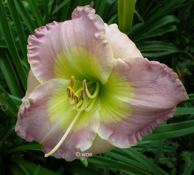 sehr schönes Foto von der Mitte. Manchmal sehe ich auch so einen scharf abgegrenzten Blütenschlund, aber nicht immer. Auch die Hauptfarbe wechselt wie bei allen hell Lavendelfarbenen mal mehr nach bläulich Lavendel und manchmal mehr nach rosa Lavendel.Weiter oben hatte ich ein Foto ausgesucht, das dem von Hempassion am nächsten kam - wegen der IdentifizierungMein blaues Wunder sieht so aus, hat eine wundervolle grüne Mitte!