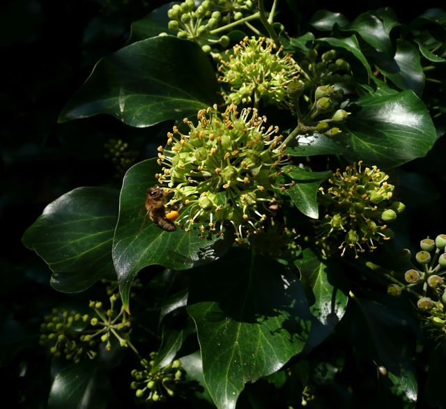 ), dass das Summen weithin zu hören ist: die Altersform des Efeu auf der alten Mauer unter der Eiche. Ich freu mich jedesmal, wenn ich auf dem Weg in den Garten dort vorbeigehe.